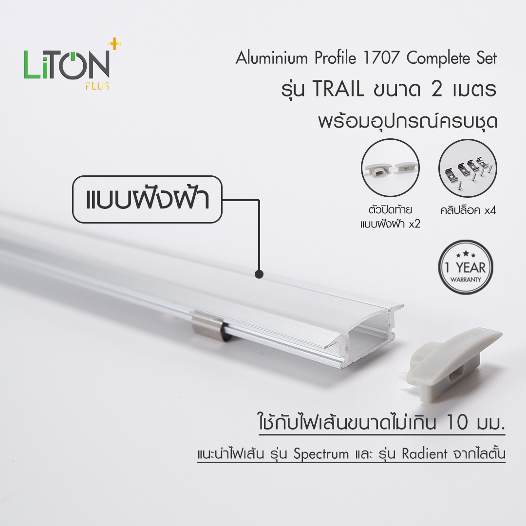 ชุด LiTON+ อลูโปรไฟล์ รุ่น TRAIL 2 เมตร 1707 ครบชุด เป็นชุดรางอลูมิเนียมโปรไฟล์สำหรับไฟ LED เส้น (LED Strip Light) ที่ออกแบบมาเพื่อการติดตั้งเพื่อให้แสงออกมาเรียบเนียนและสวยงาม